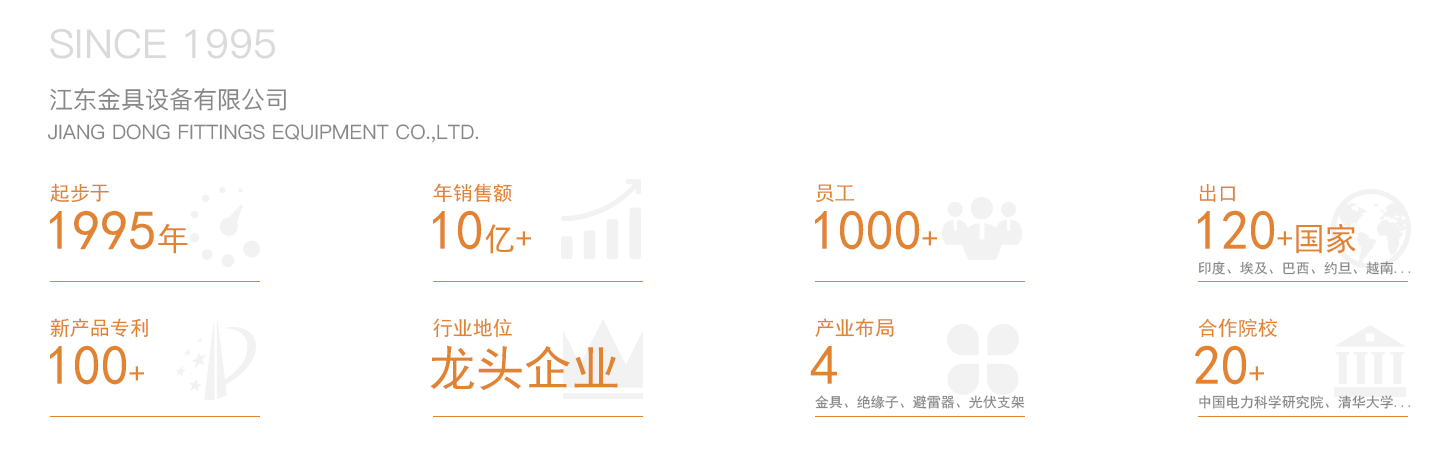 江东金具设备有限公司系江苏中天科技股份有限公司(上市代码600522)全资子公司,创建于1995年,注册资金55140.91万元整,占地146000平方米,拥有118000平方米的标准厂房,共有员工1000人,其中工程技术和研发人员150人,是专业制造金具、绝缘子、避雷器和光伏支架等产品的高新技术企业。